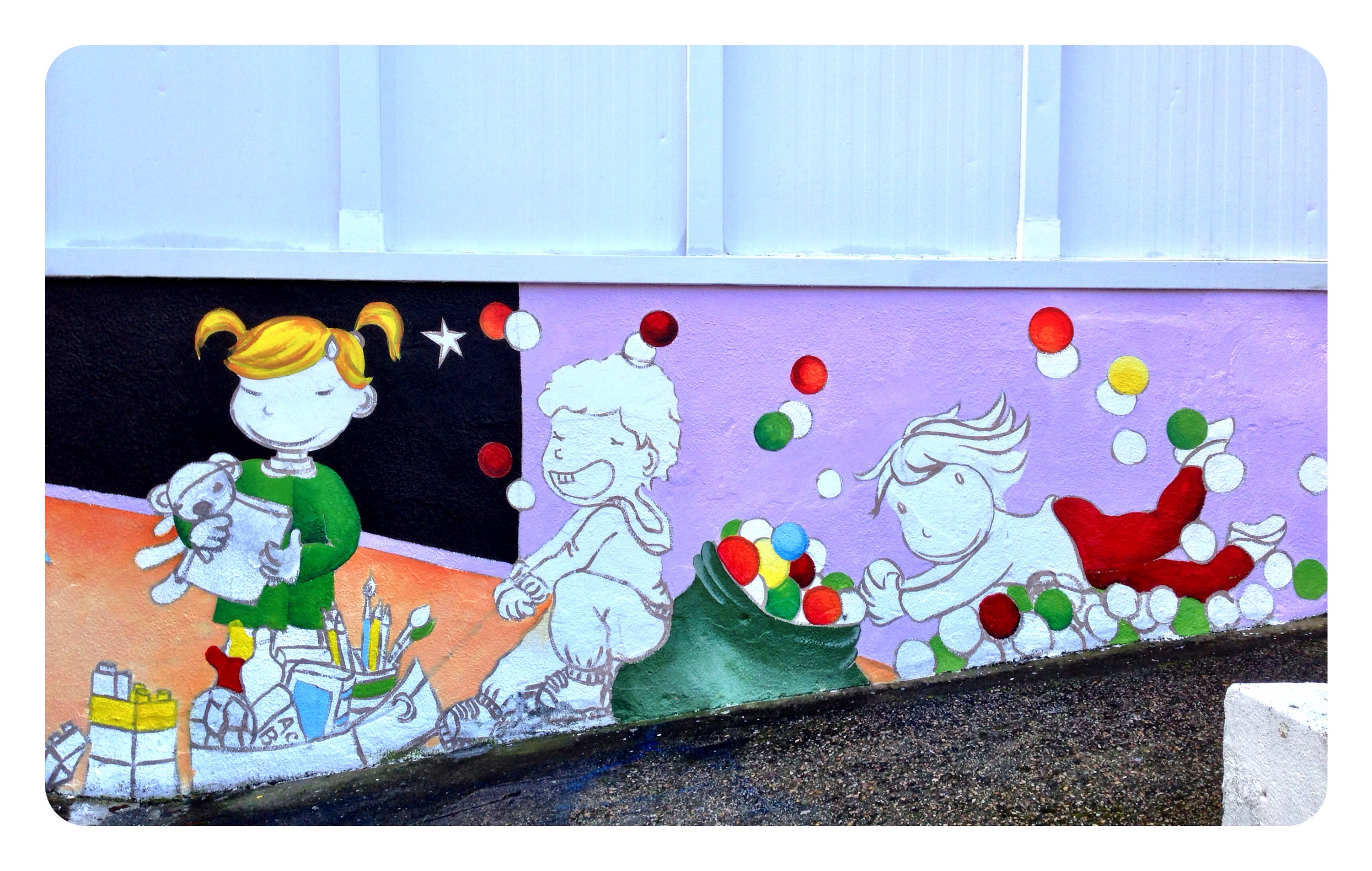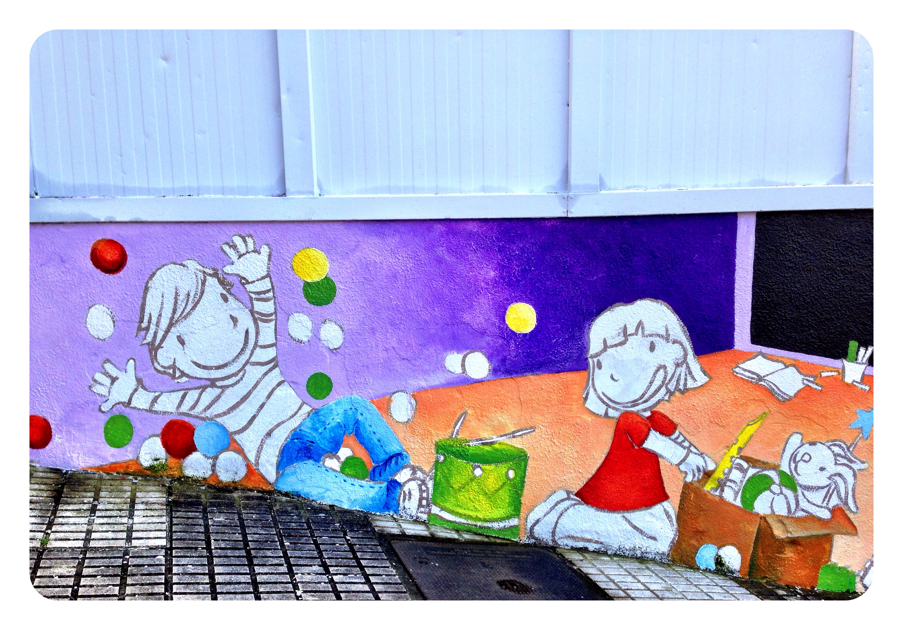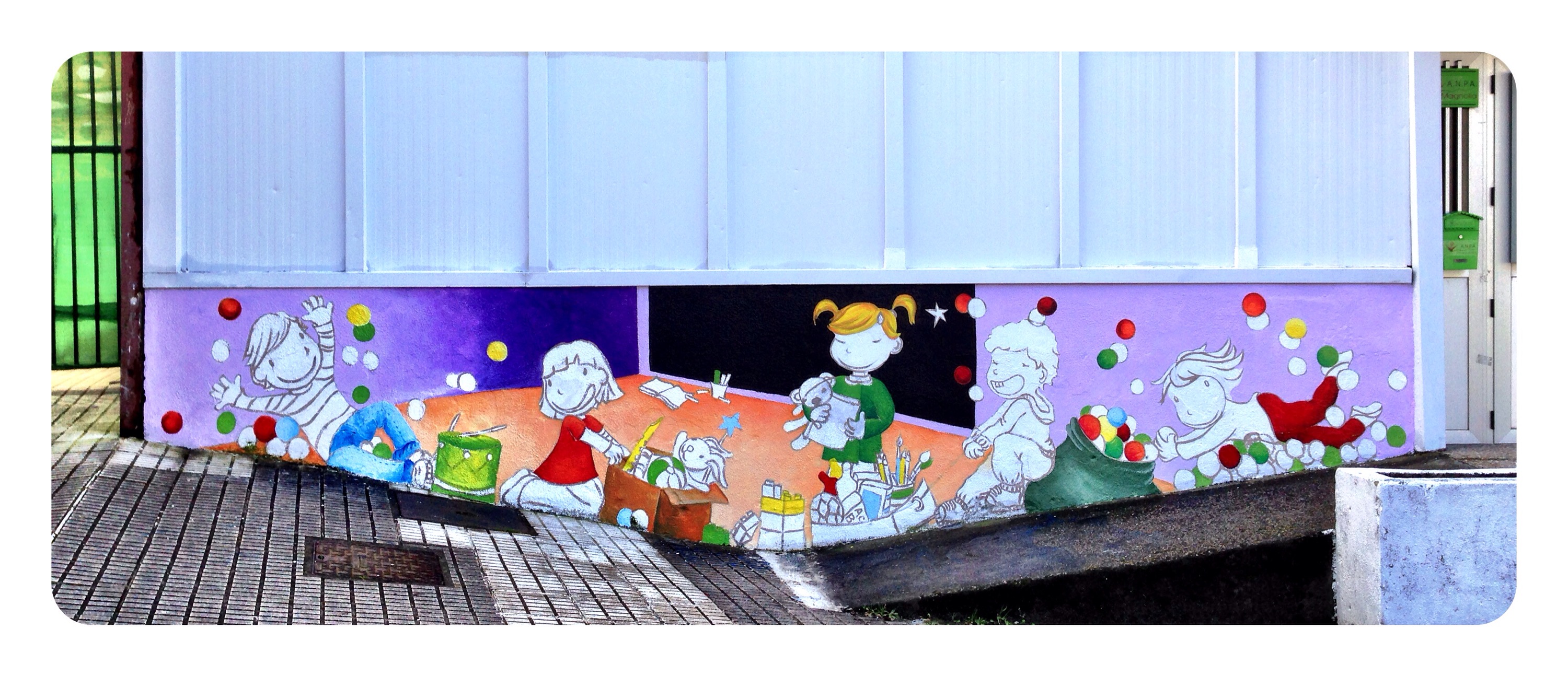 Entre nube y nube…entre que llueve y el sol se asoma…vamos dando ya color al primero de un conjunto de 3 grandes murales que completan los 100m2 que rodean este Aulario de un Colegio infantil en Vigo.