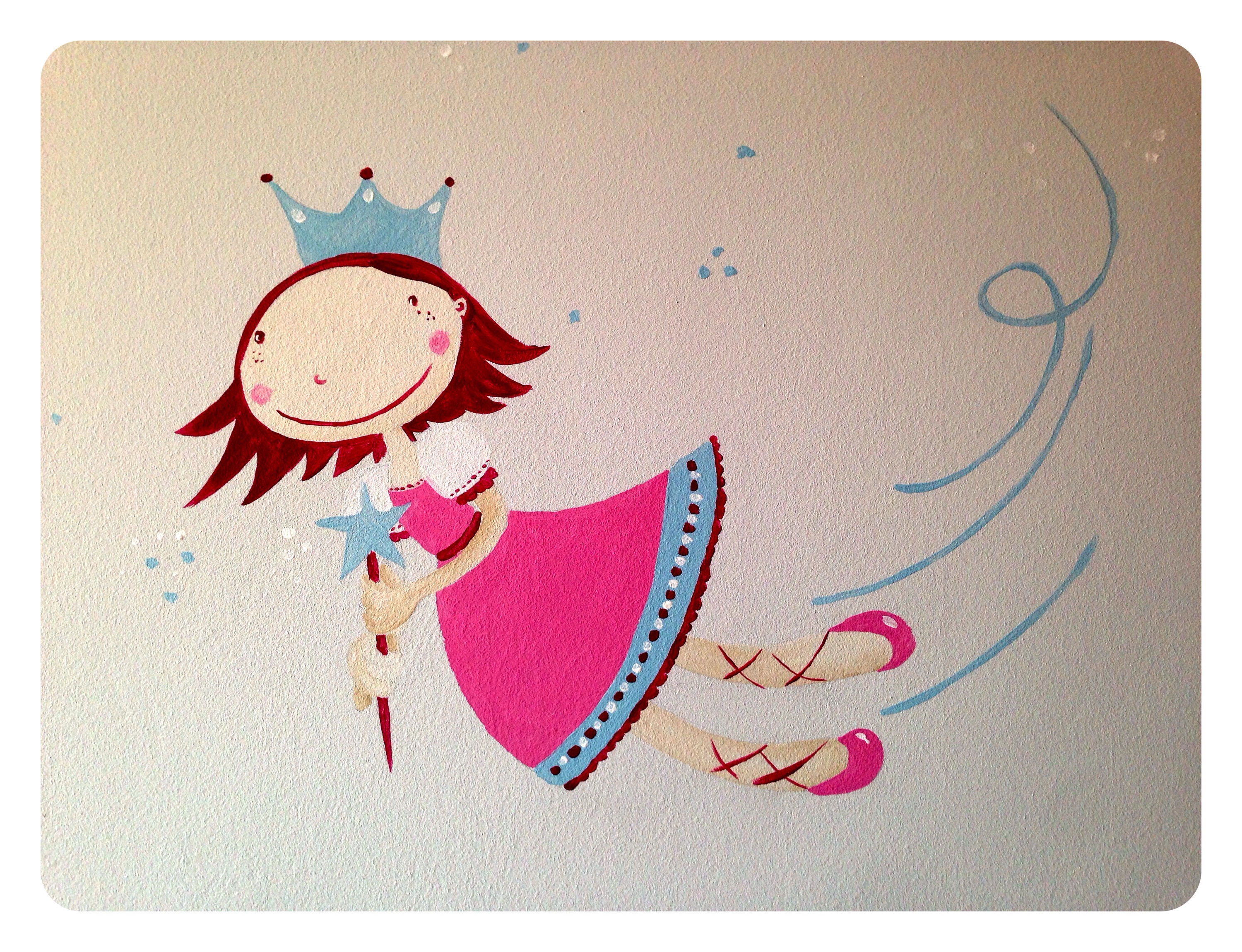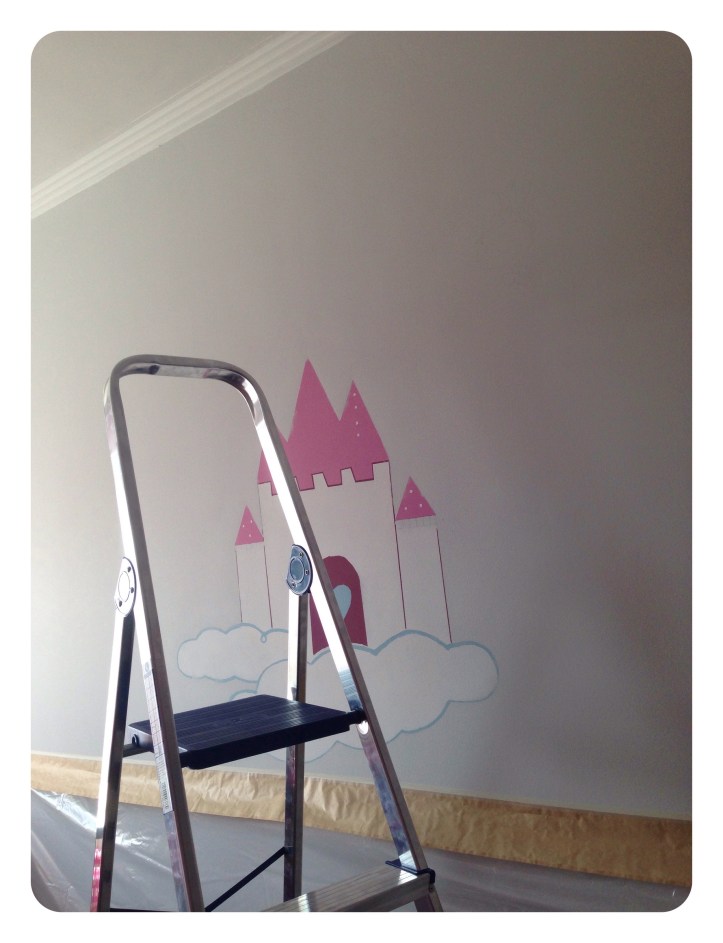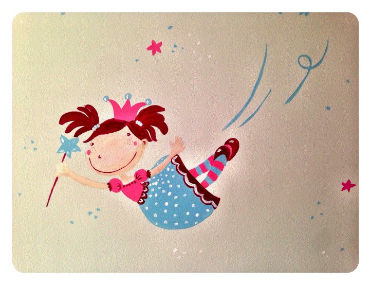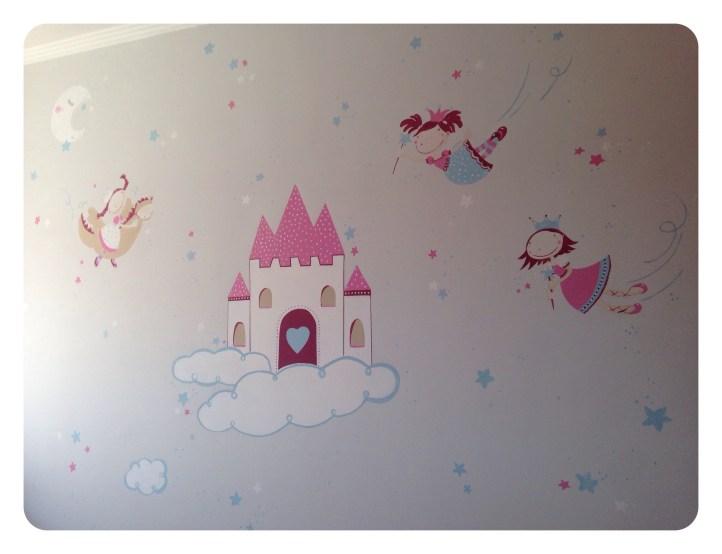El resultado…una delicada ilustraciòn que endulza la pared de la habitaciòn haciendo imaginar a una pequeñina que en compañía de un lindo Castillo, 3 simpáticas Hadas y una Luna dormilona rodeada de estrellas, compartirán sueños cada noche!!
