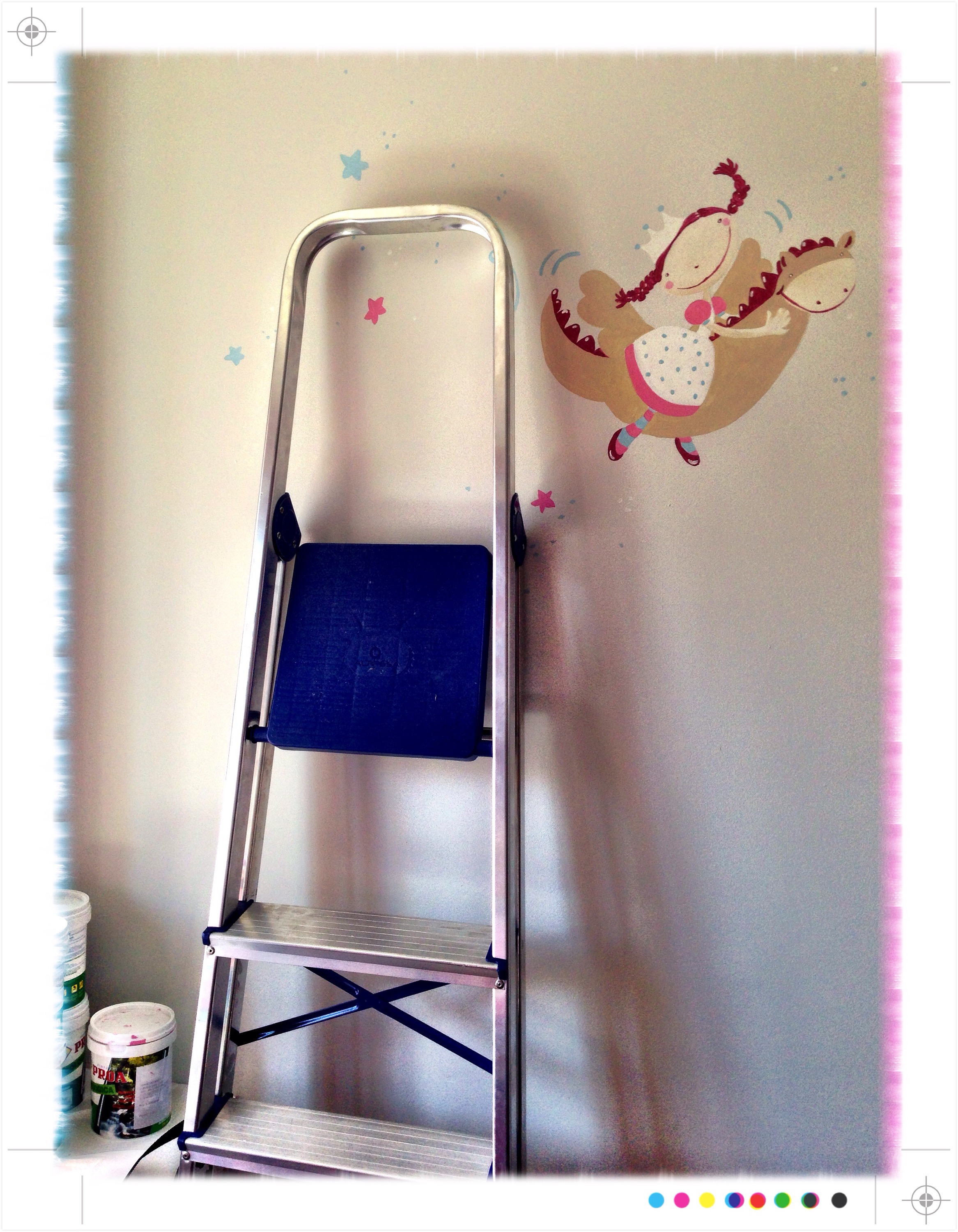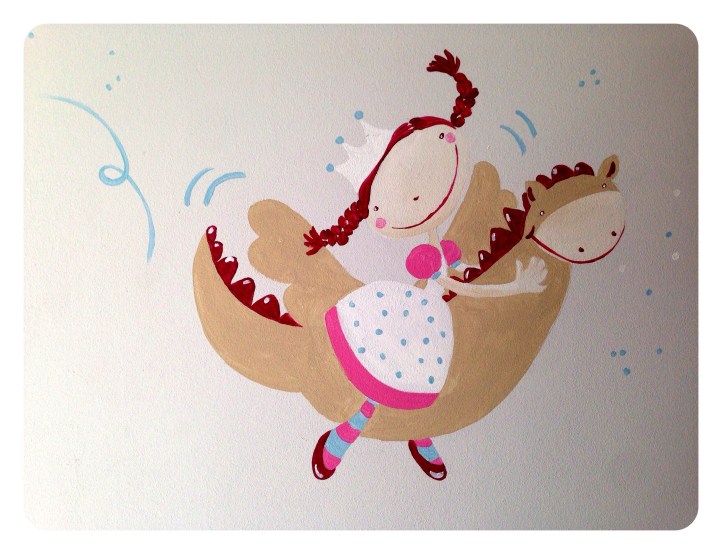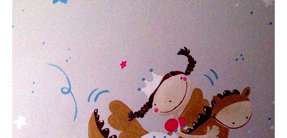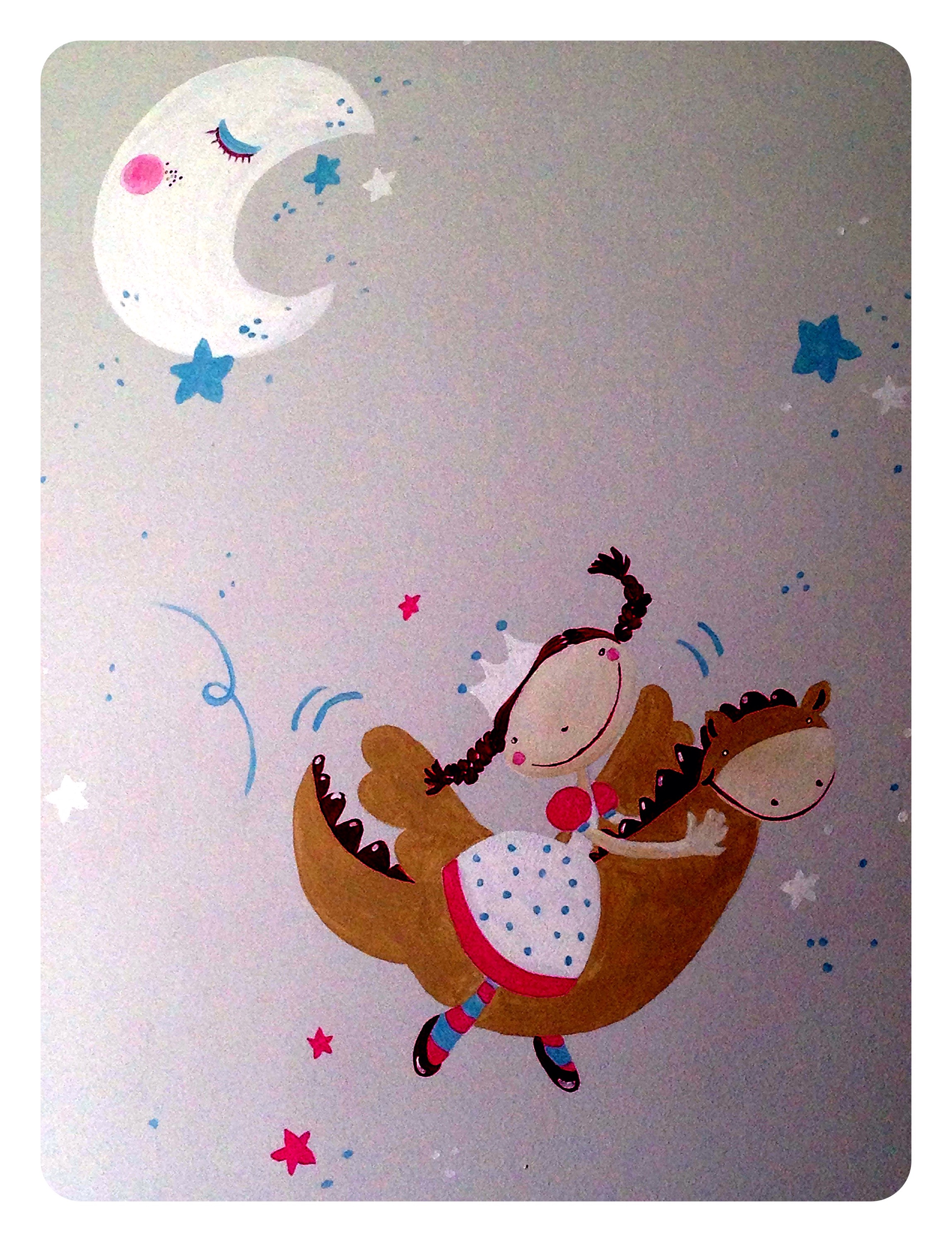 …en esta ocasiòn, hemos resuelto un bonito mural, partiendo del estampado de un edredòn q hemos matizado, variado y adaptado algunos de sus dibujos para ilustrar la pared de un dormitorio infantil.