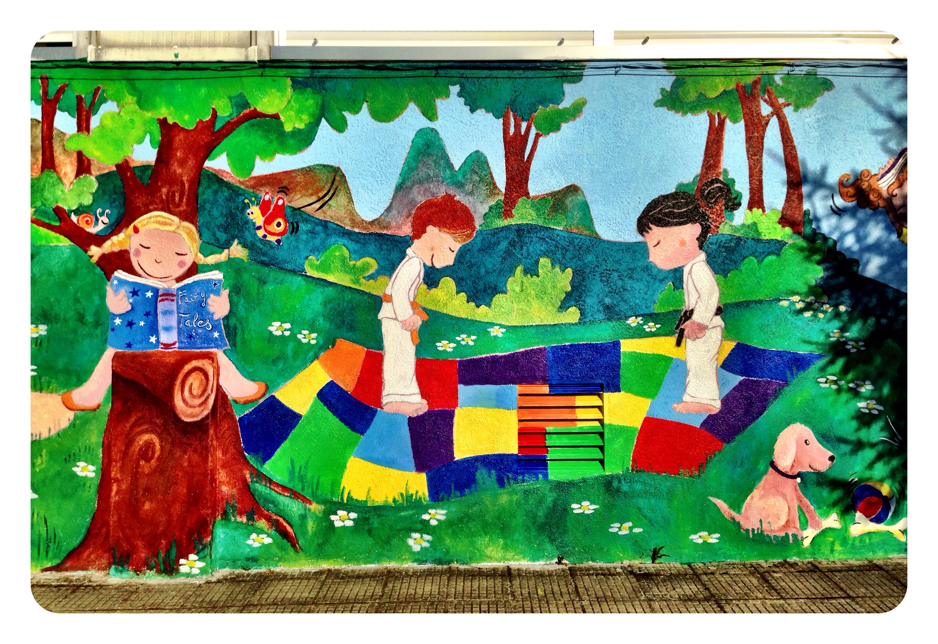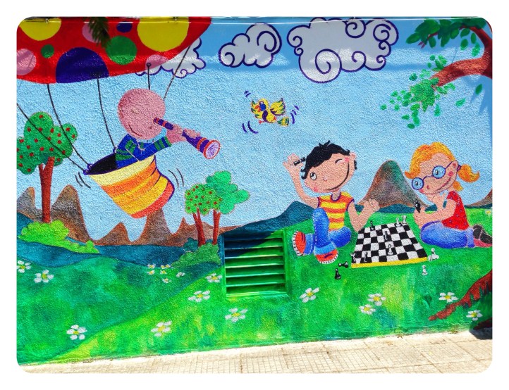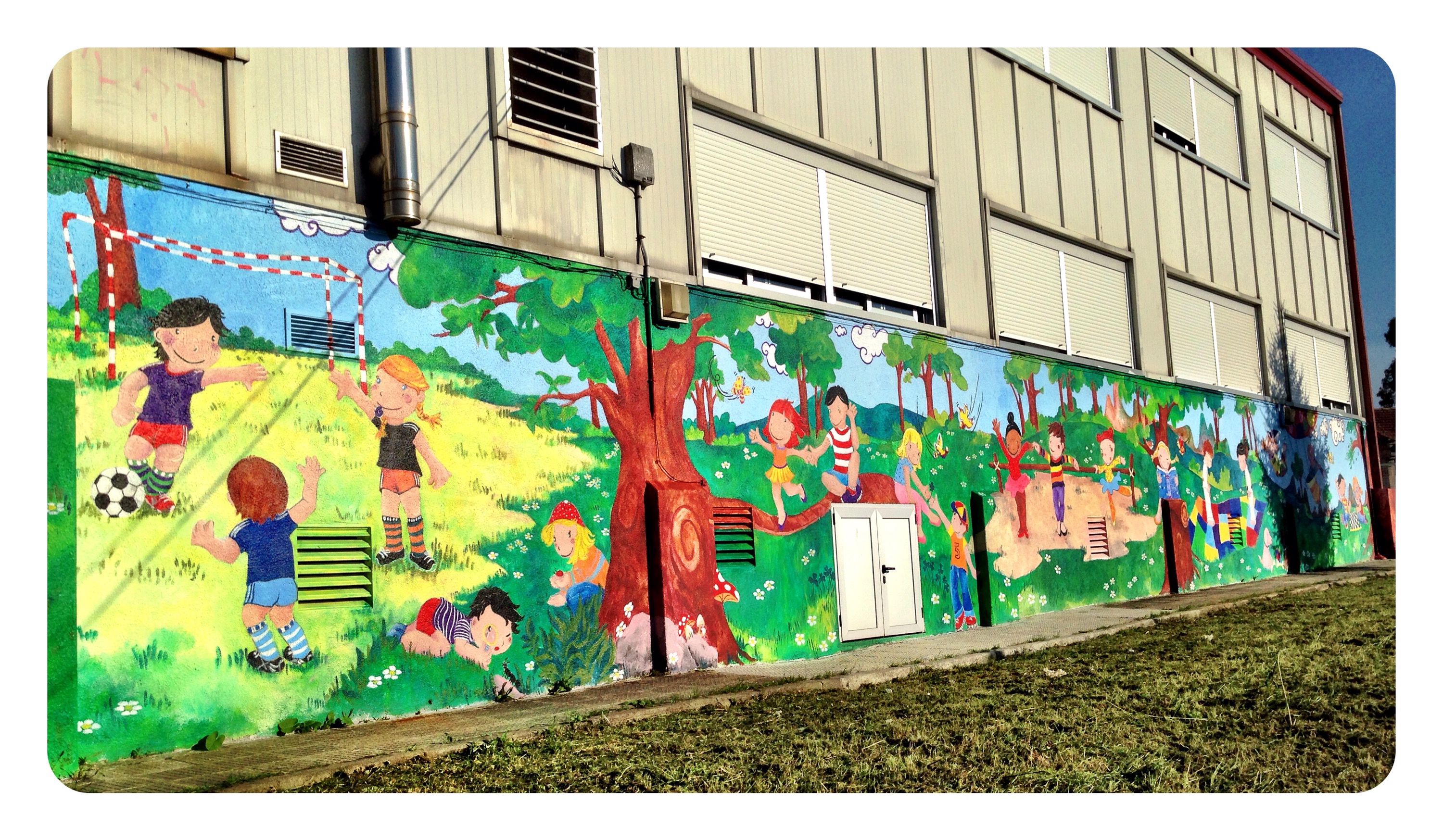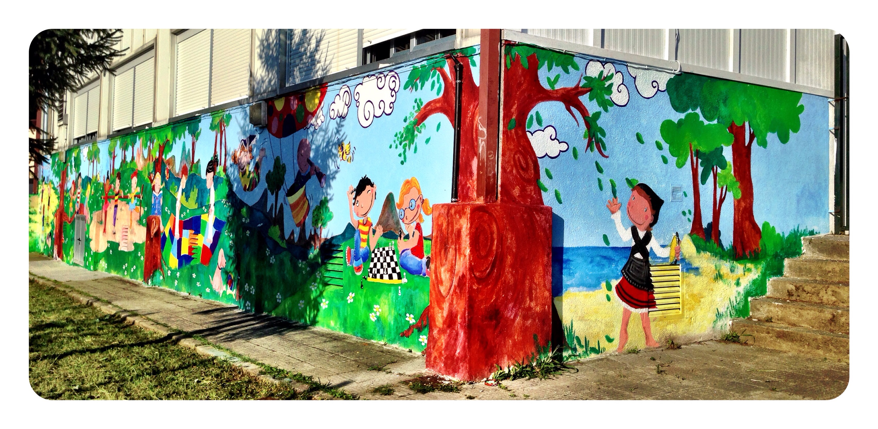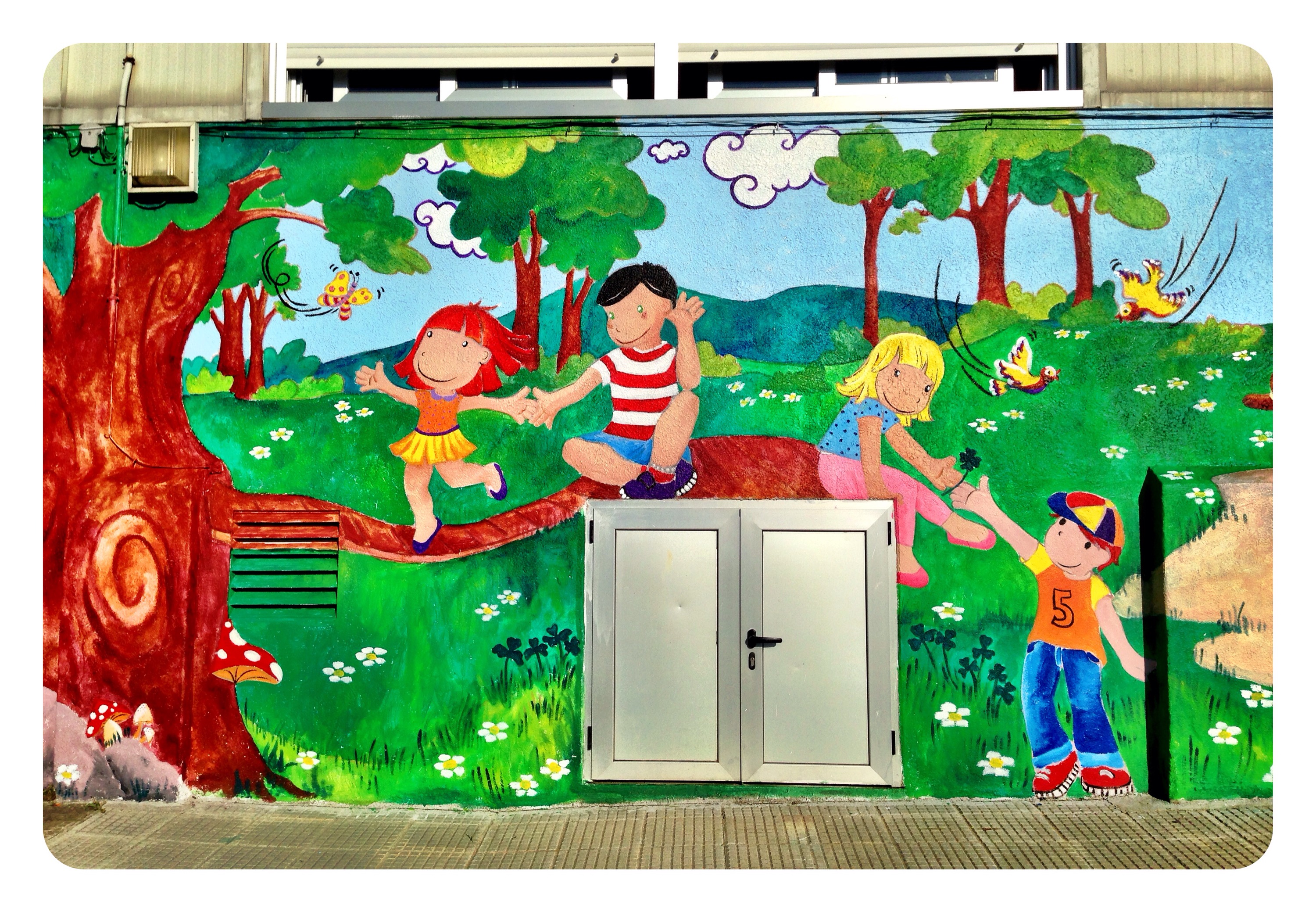 La idea era ilustrar un poquito aquellas paredes para contar lo que allí dentro ocurría cada día…niñas y niños jugando, aprendiendo… Y realizando un montòn de actividades para desarrollar al máximo posible sus capacidades, talentos, inquietudes…baile, danza, música, deporte, ajedrez, idiomas, curiosidad por la lectura, el entorno…juegos, valores, actividades q poco a poco irán formando parte de sus vidas y que ya en sus primeros años de cole pueden descubrir.