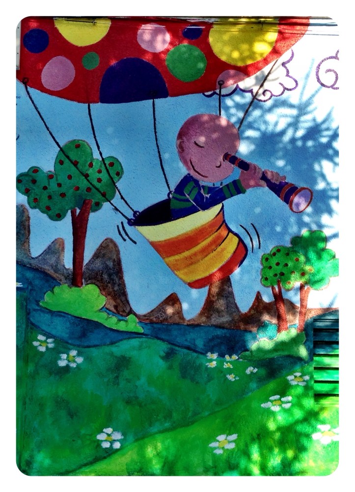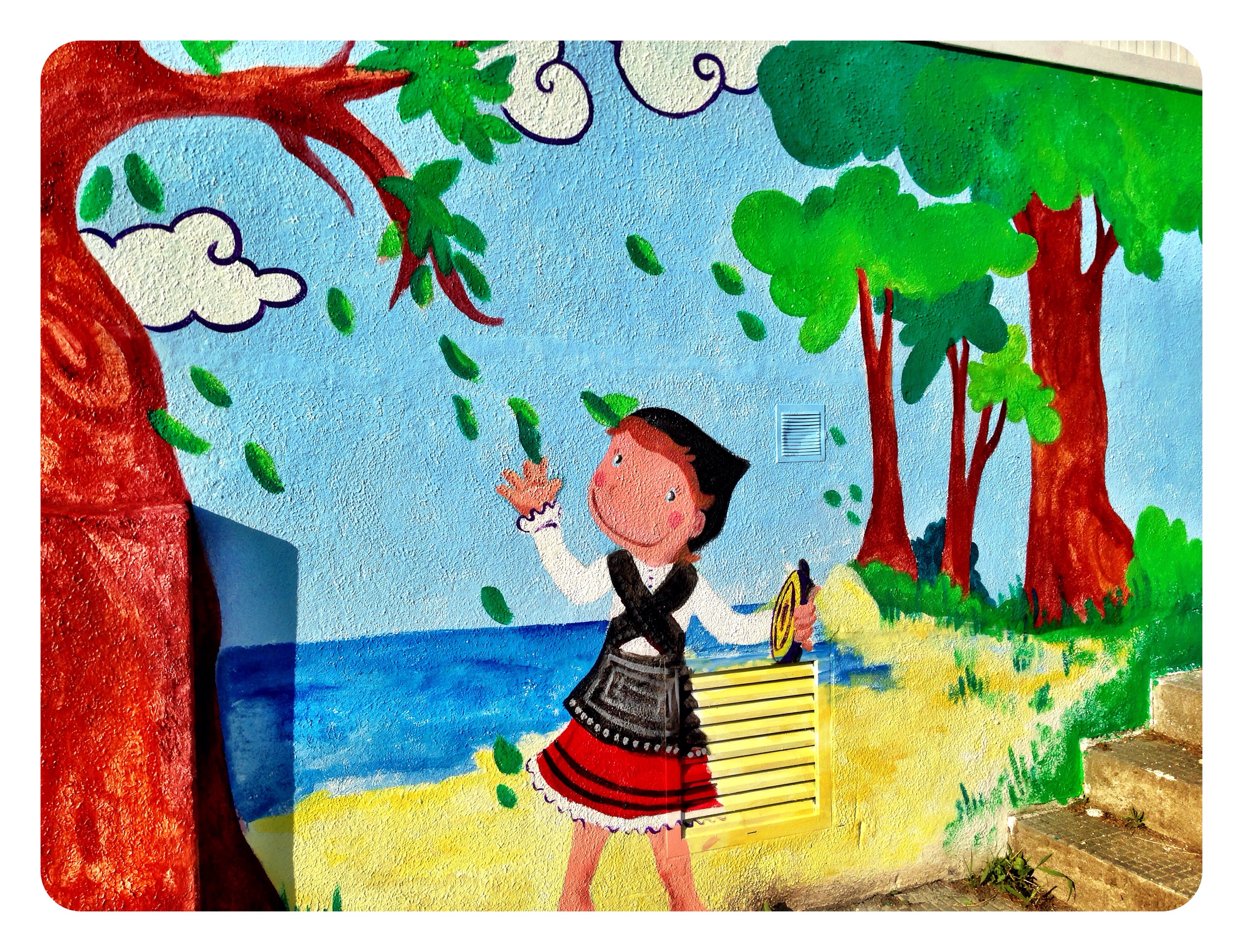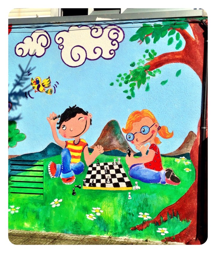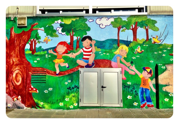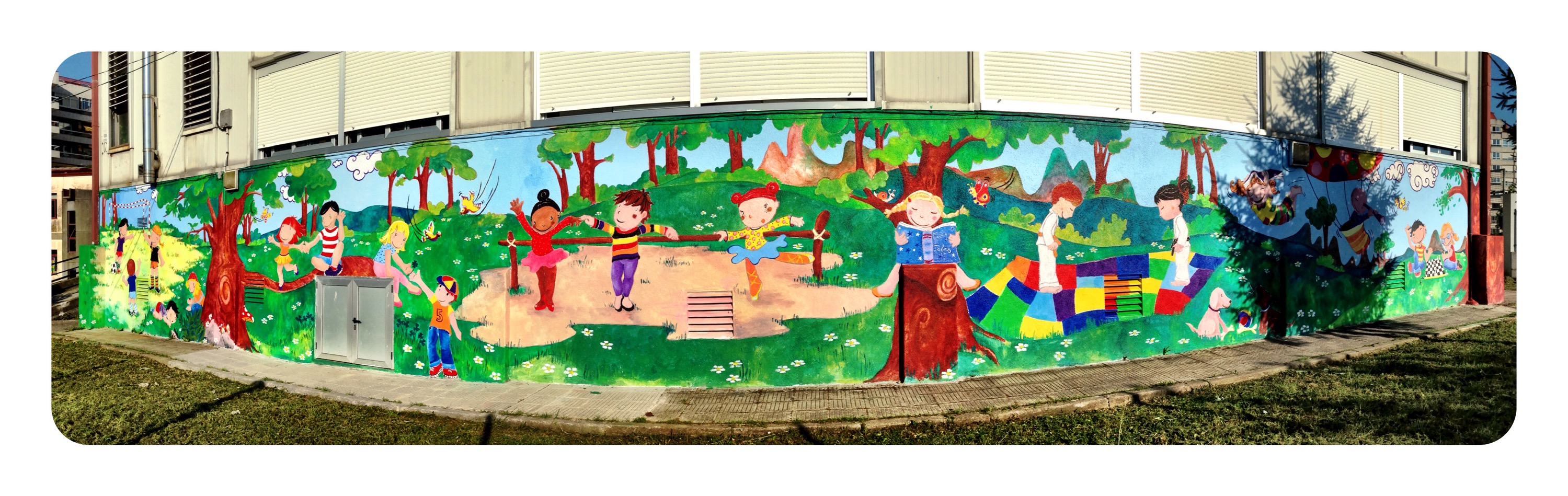 La idea era ilustrar un poquito aquellas paredes para contar lo que allí dentro ocurría cada día…niñas y niños jugando, aprendiendo… Y realizando un montòn de actividades para desarrollar al máximo posible sus capacidades, talentos, inquietudes…baile, danza, música, deporte, ajedrez, idiomas, curiosidad por la lectura, el entorno…juegos, valores, actividades q poco a poco irán formando parte de sus vidas y que ya en sus primeros años de cole pueden descubrir.