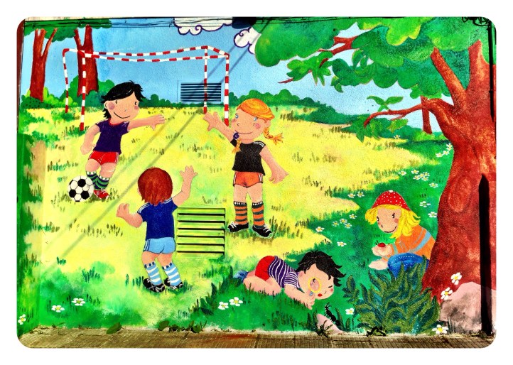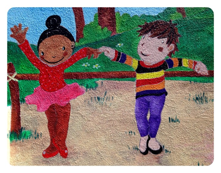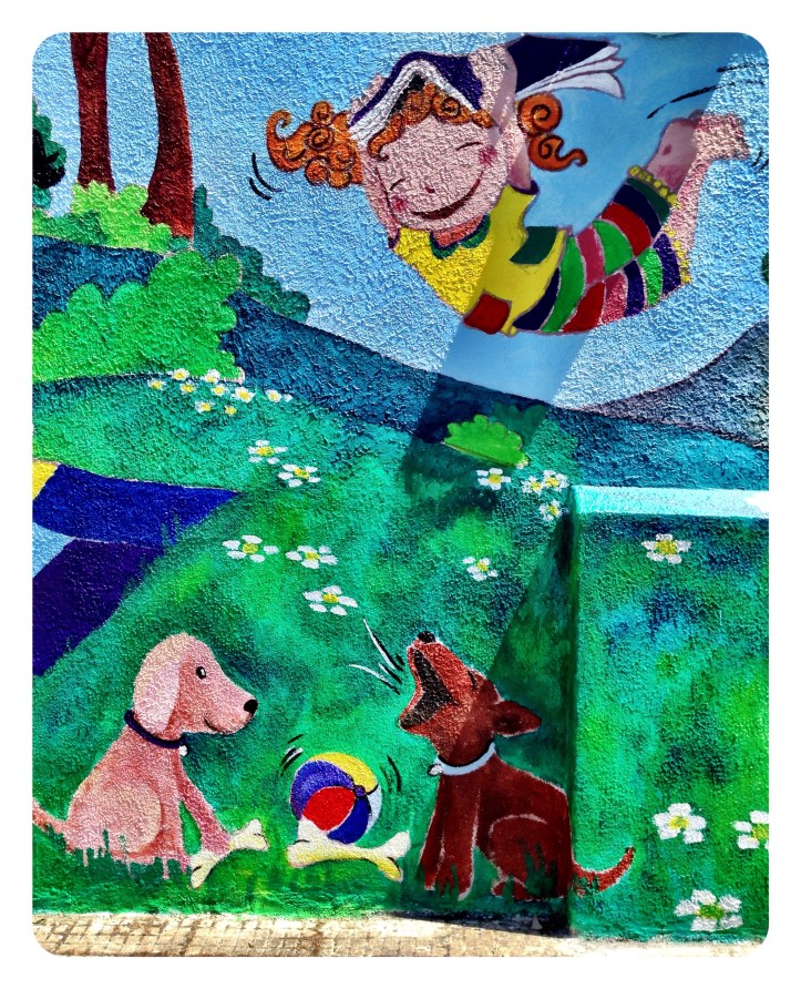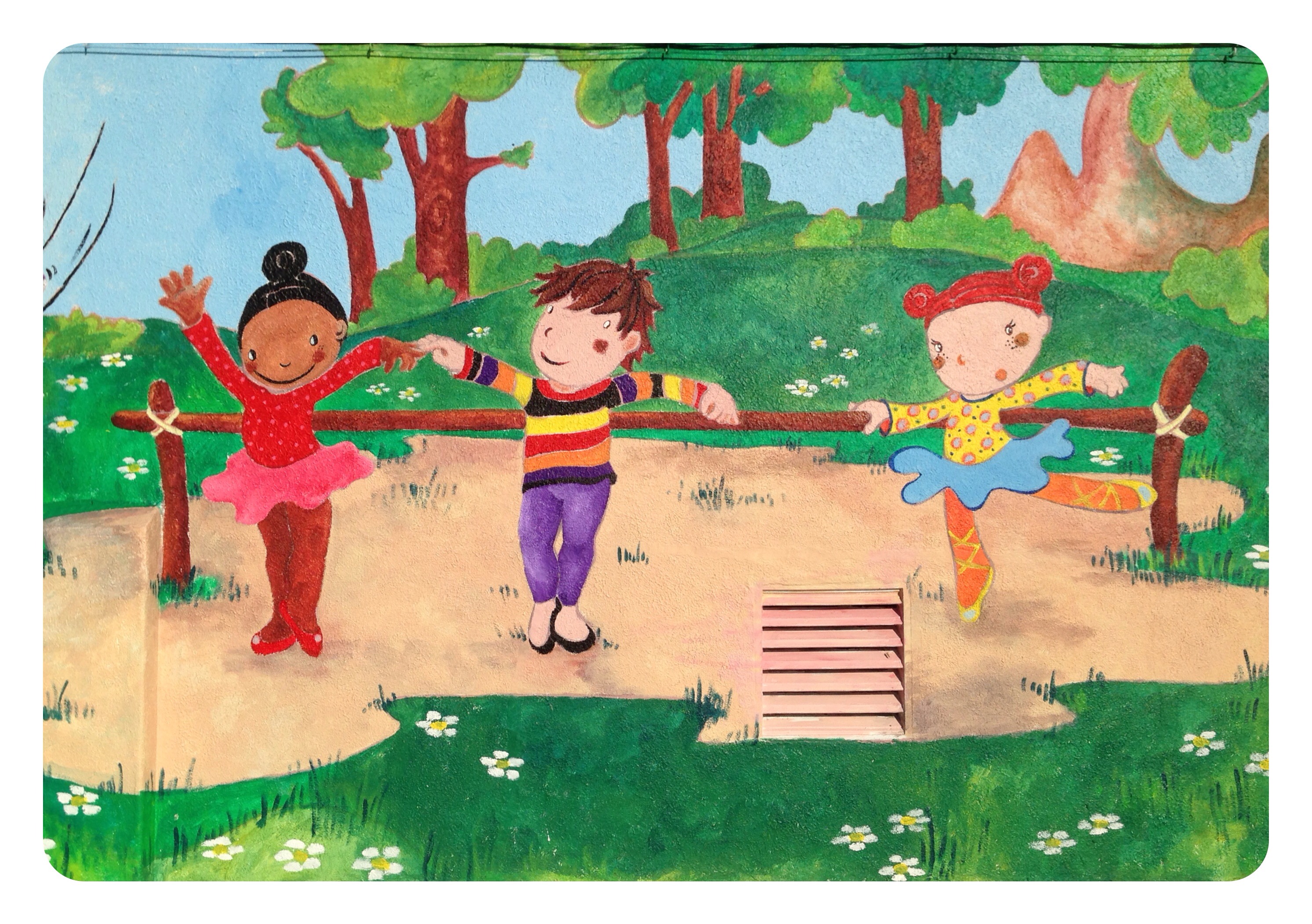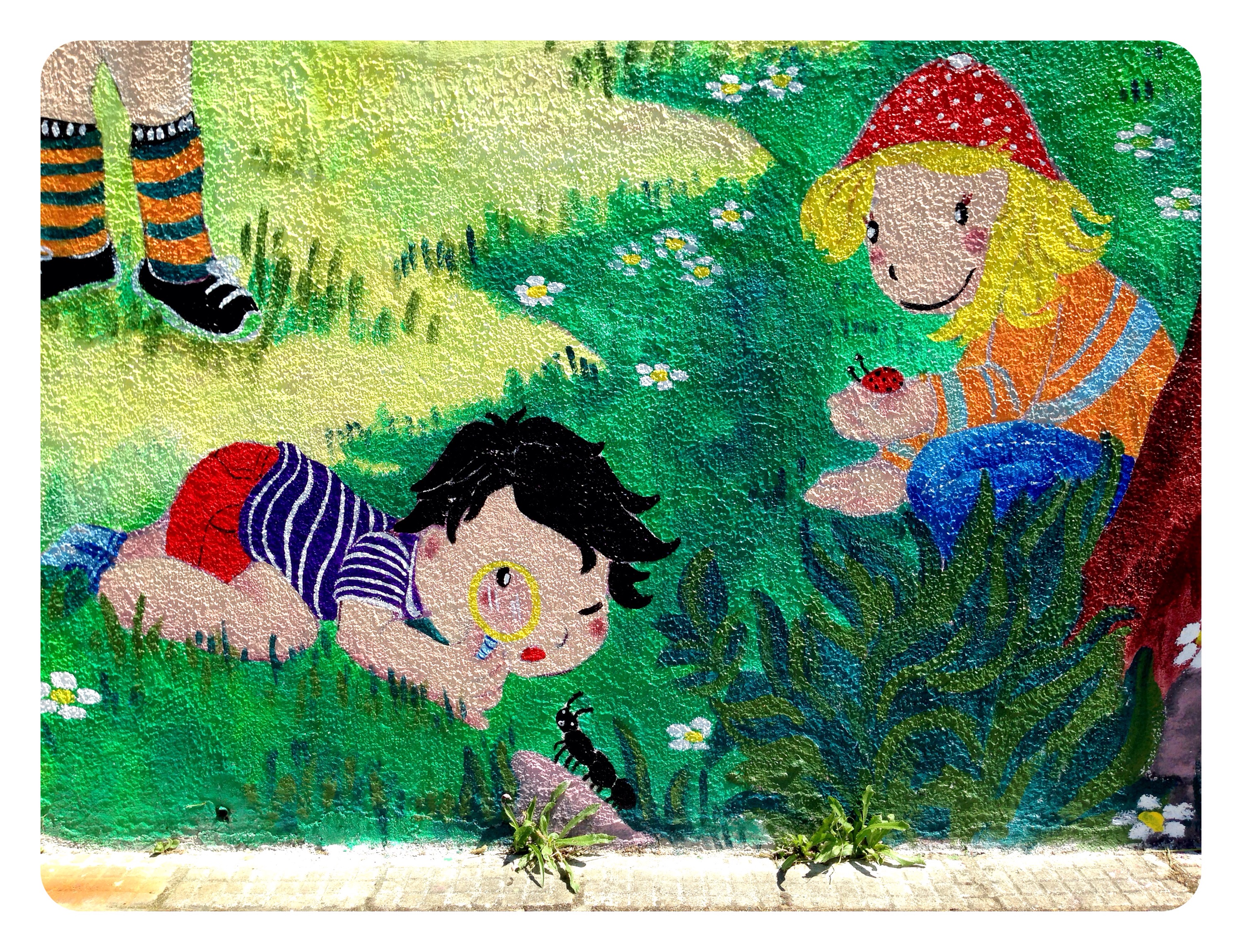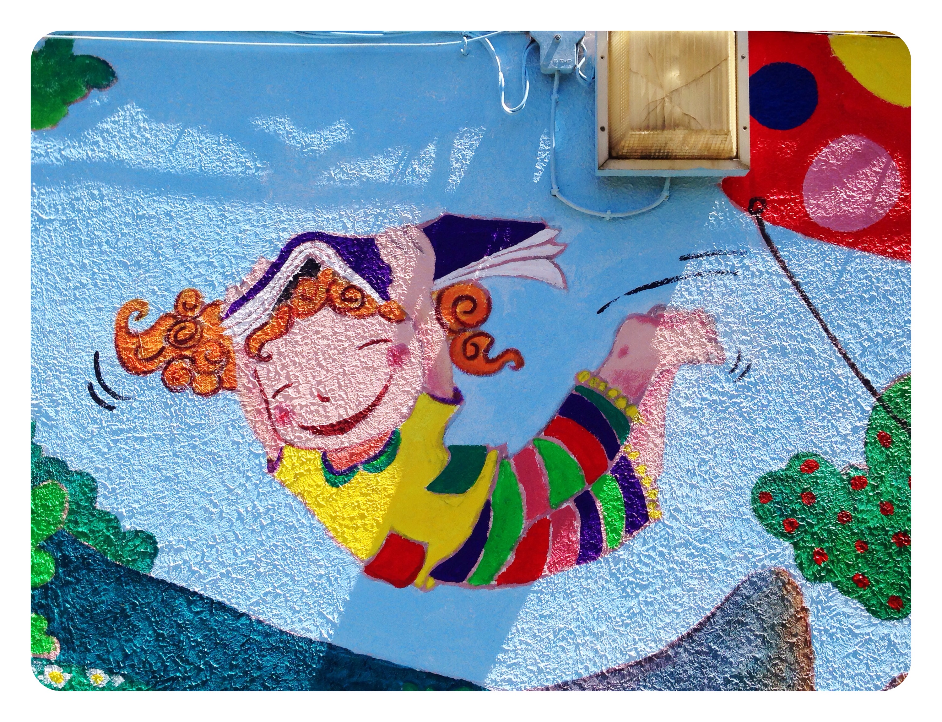 La idea era ilustrar un poquito aquellas paredes para contar lo que allí dentro ocurría cada día…niñas y niños jugando, aprendiendo… Y realizando un montòn de actividades para desarrollar al máximo posible sus capacidades, talentos, inquietudes…baile, danza, música, deporte, ajedrez, idiomas, curiosidad por la lectura, el entorno…juegos, valores, actividades q poco a poco irán formando parte de sus vidas y que ya en sus primeros años de cole pueden descubrir.
