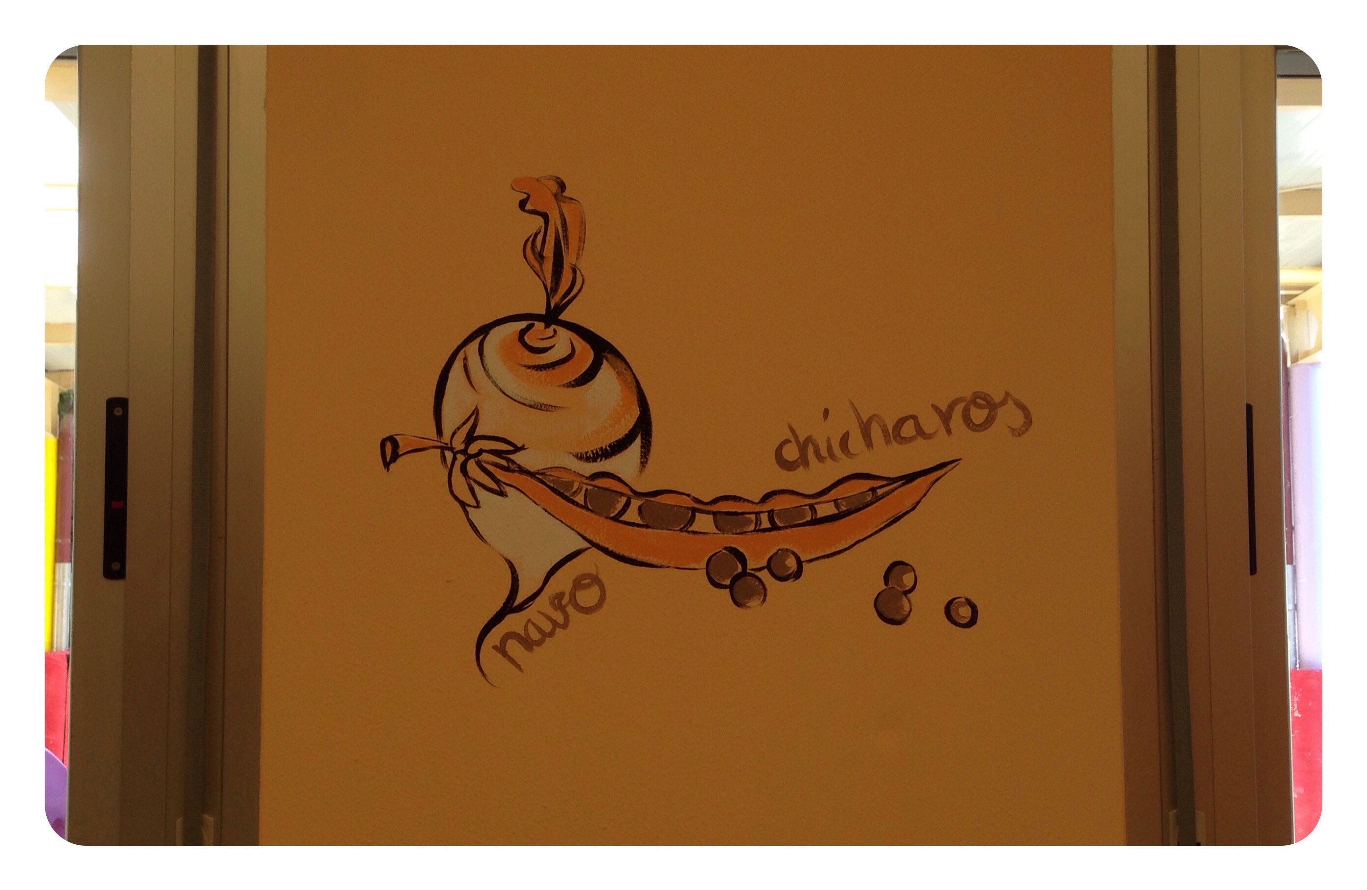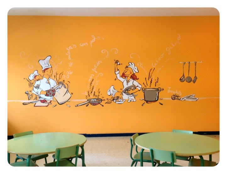 Se trataba de animar un comedor infantil, pintando sobre un luminoso color melocotòn, utilizando pocos colores para no cargar las paredes.