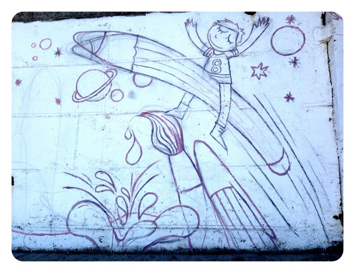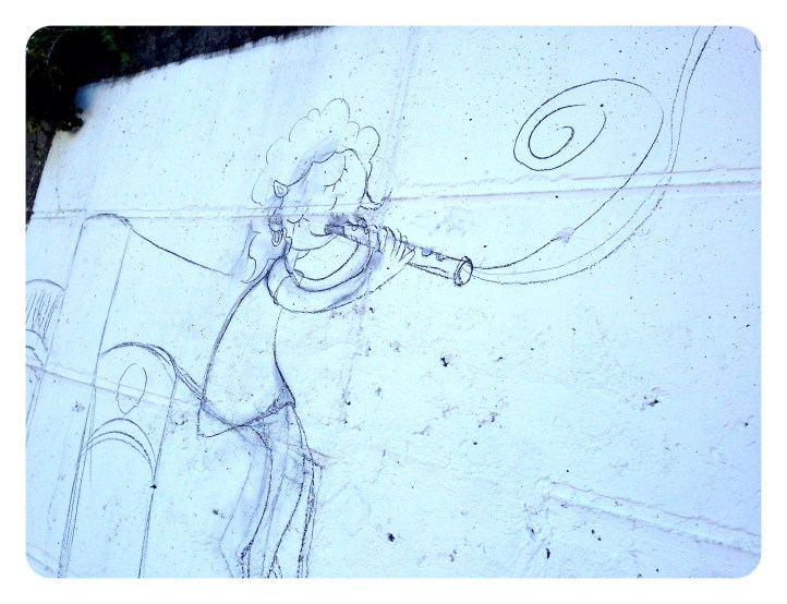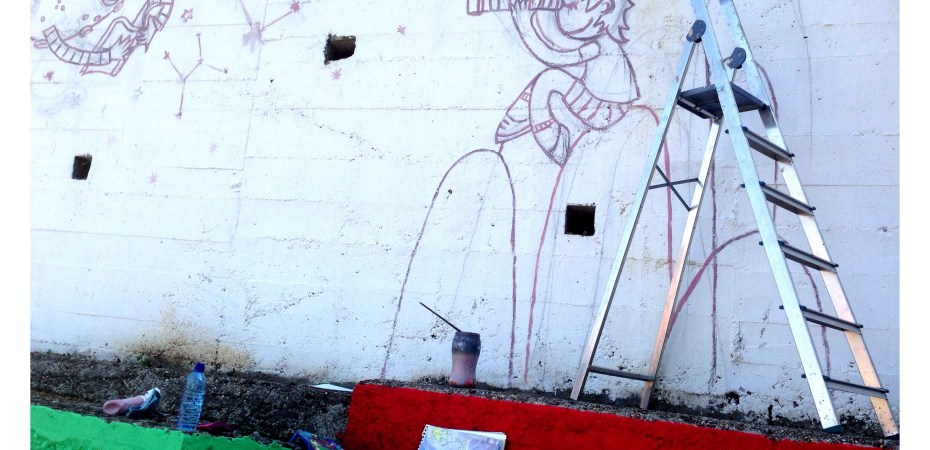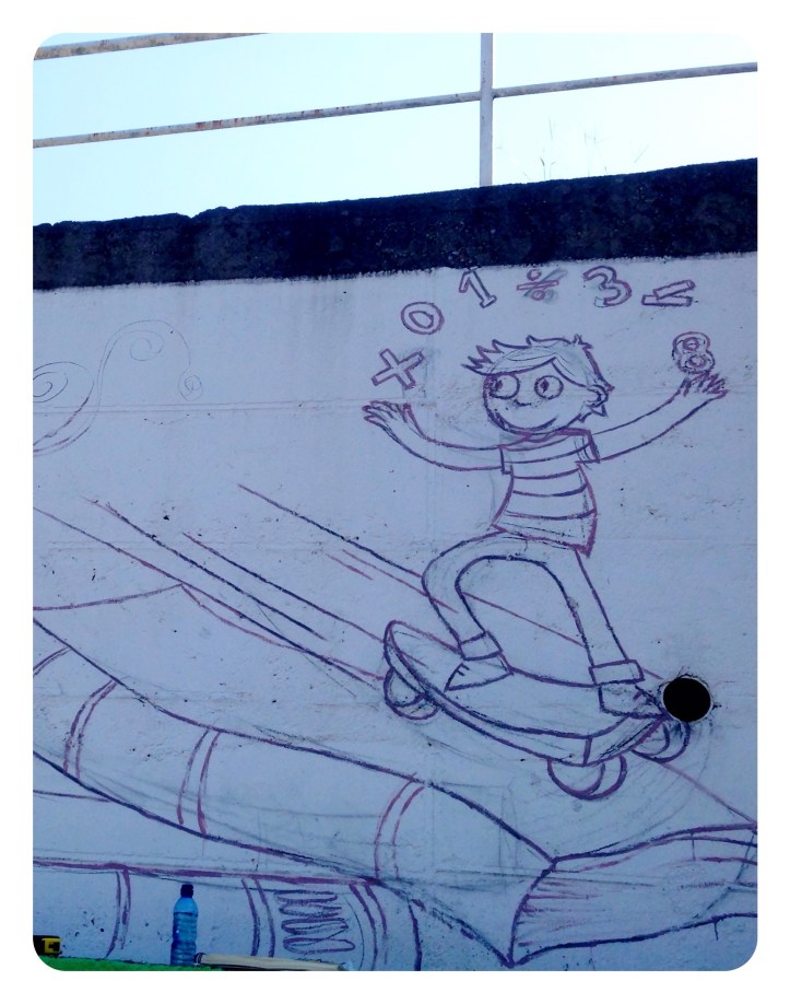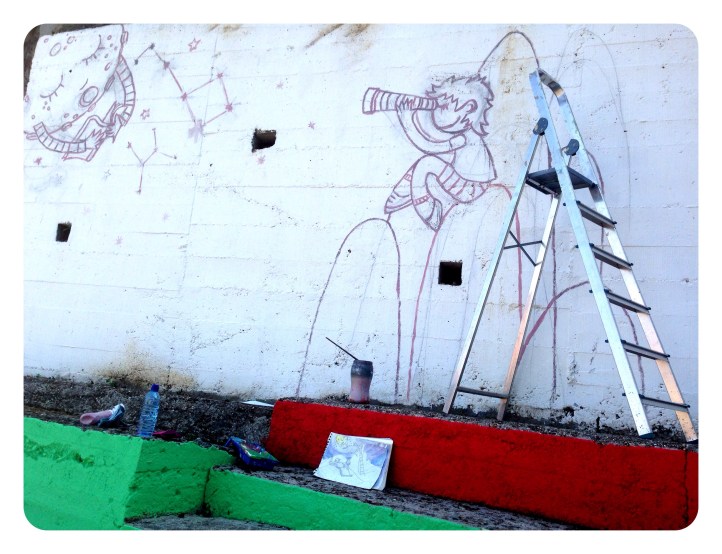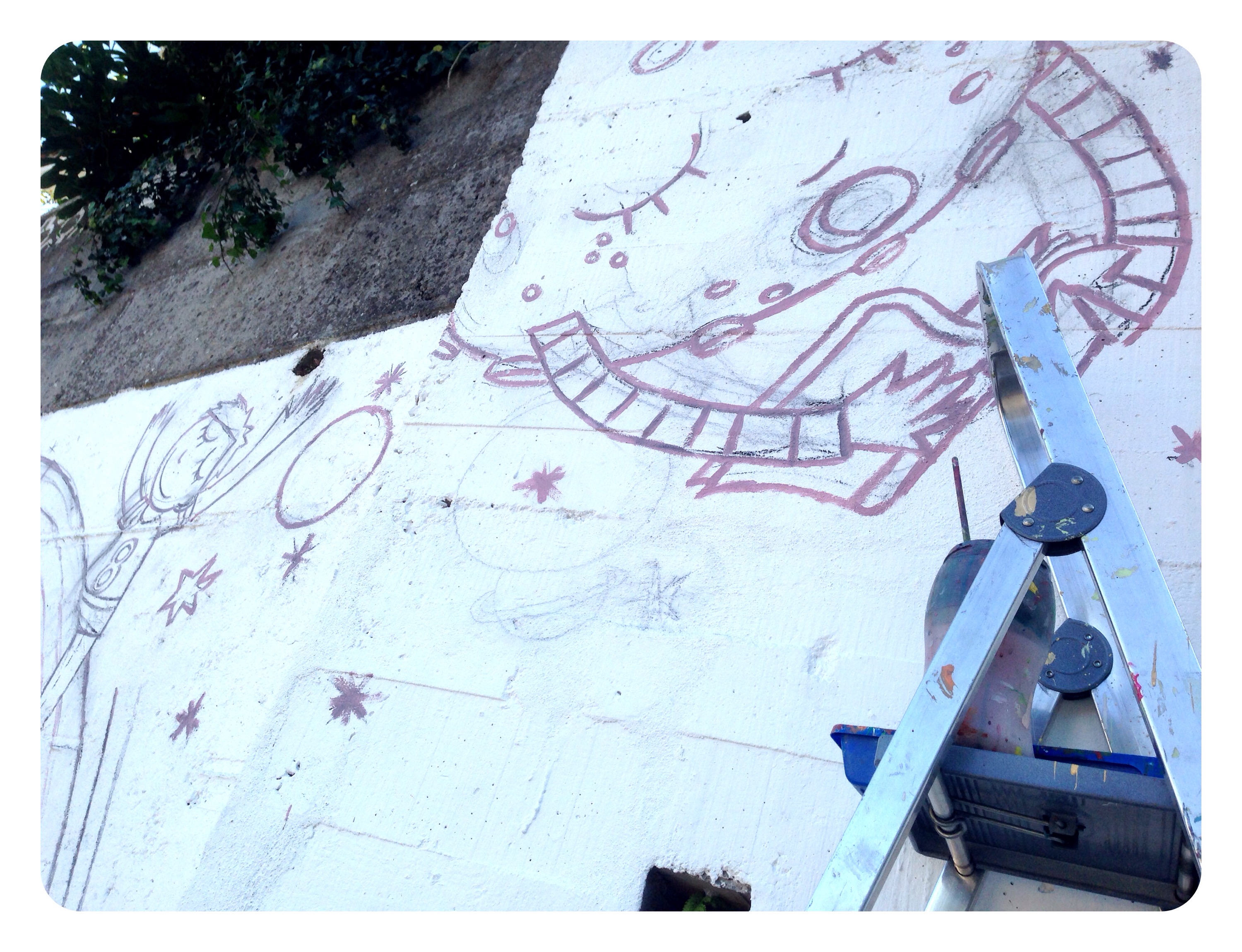 Las primeras líneas recorren el grueso muro, las ilustraciones van encajando en los huecos que el muro me susurra…porque si algo he aprendido…es que no es posible calcular al milímetro donde irá cada línea…me encanta descubrir como cada día, mirándolo atentamente…me hace cambiar las cosas de sitio…