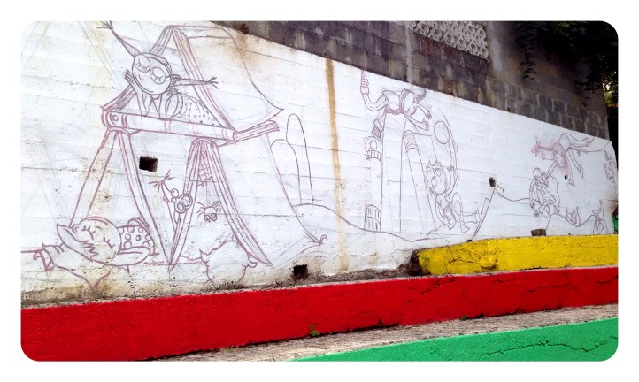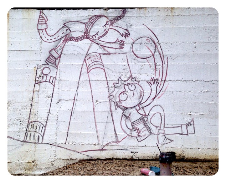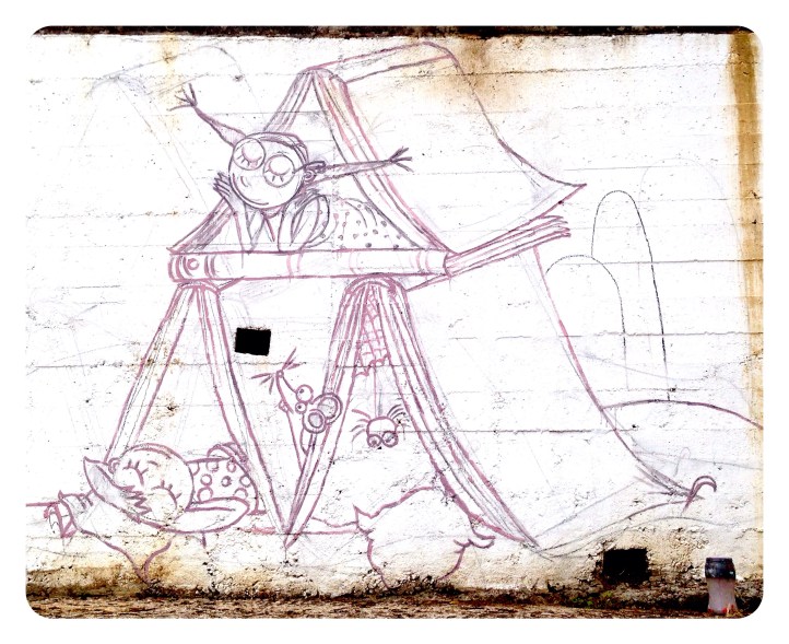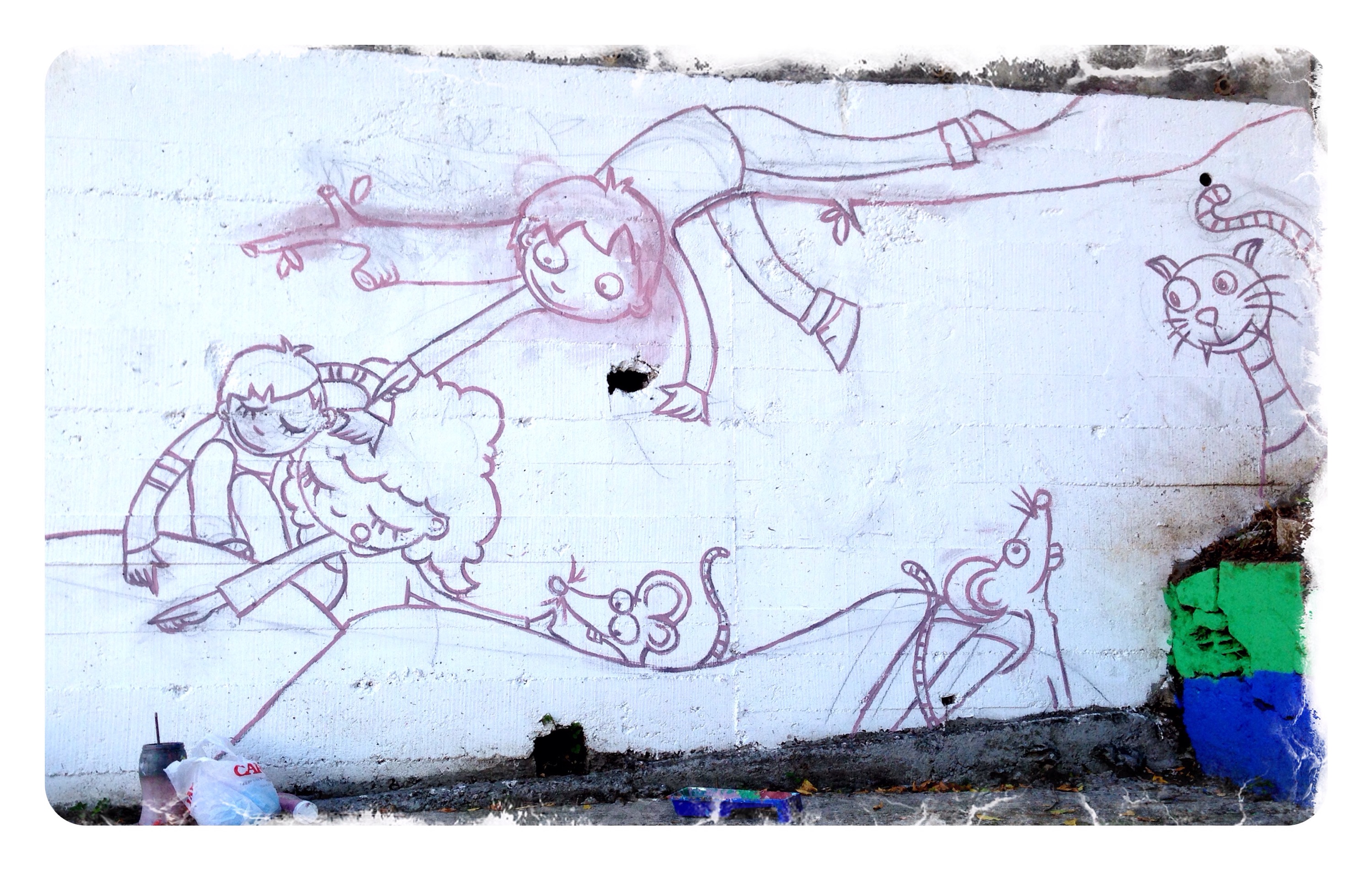 Cuando dibujo sobre él…ya intuyo q manchará el dibujo final por donde él quiera, lo gastará y lo romperá, pero ese es el precio que se paga cuando se realiza un trabajo q quedará expuesto al aire libre, a la gente que lo mire y lo toque, lo golpee…la lluvia, el viento…el sol…