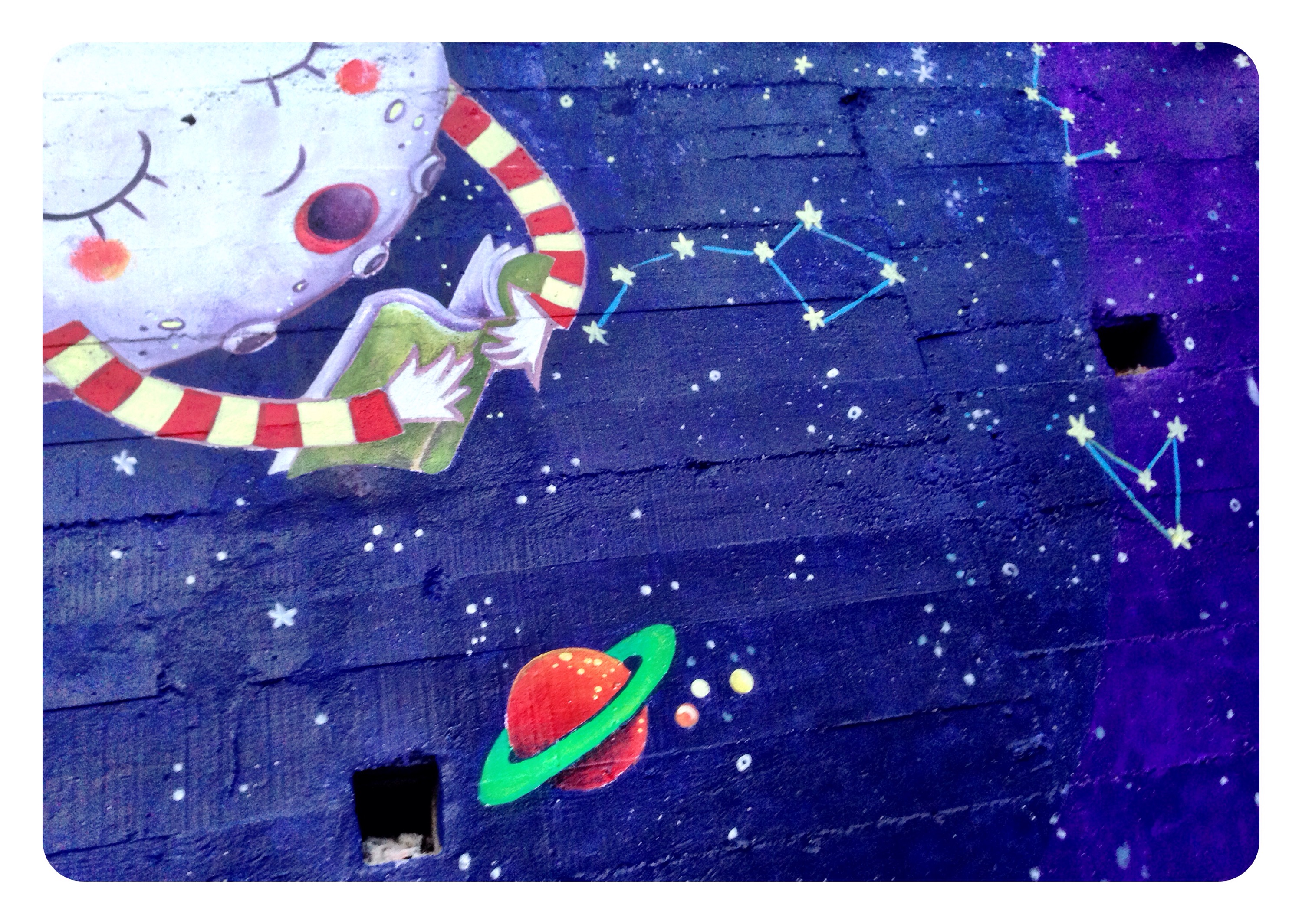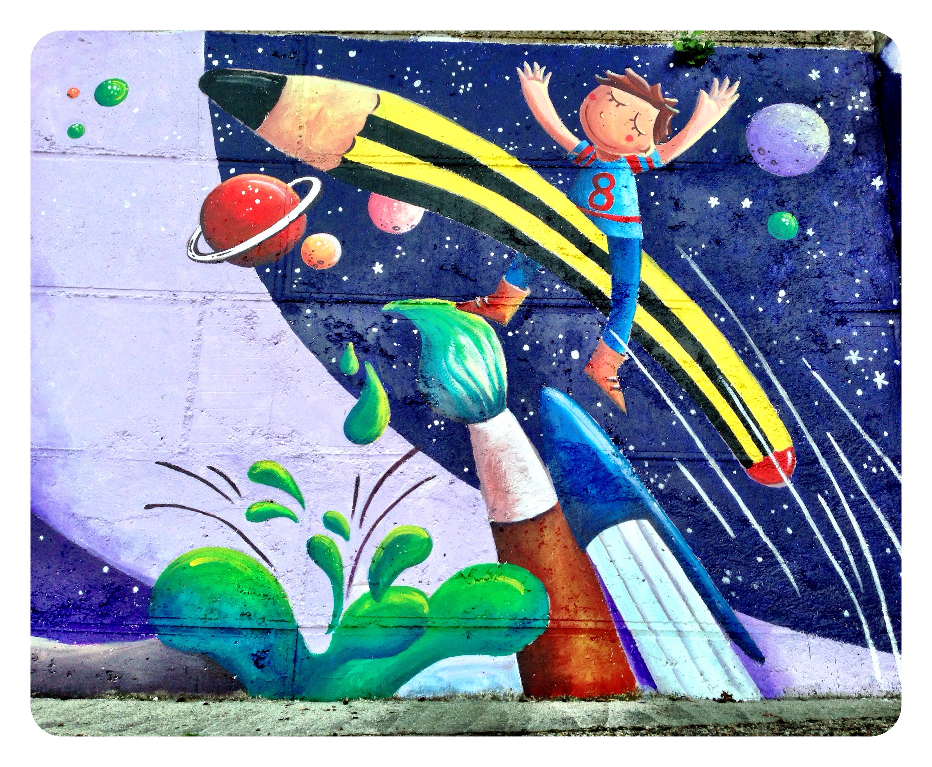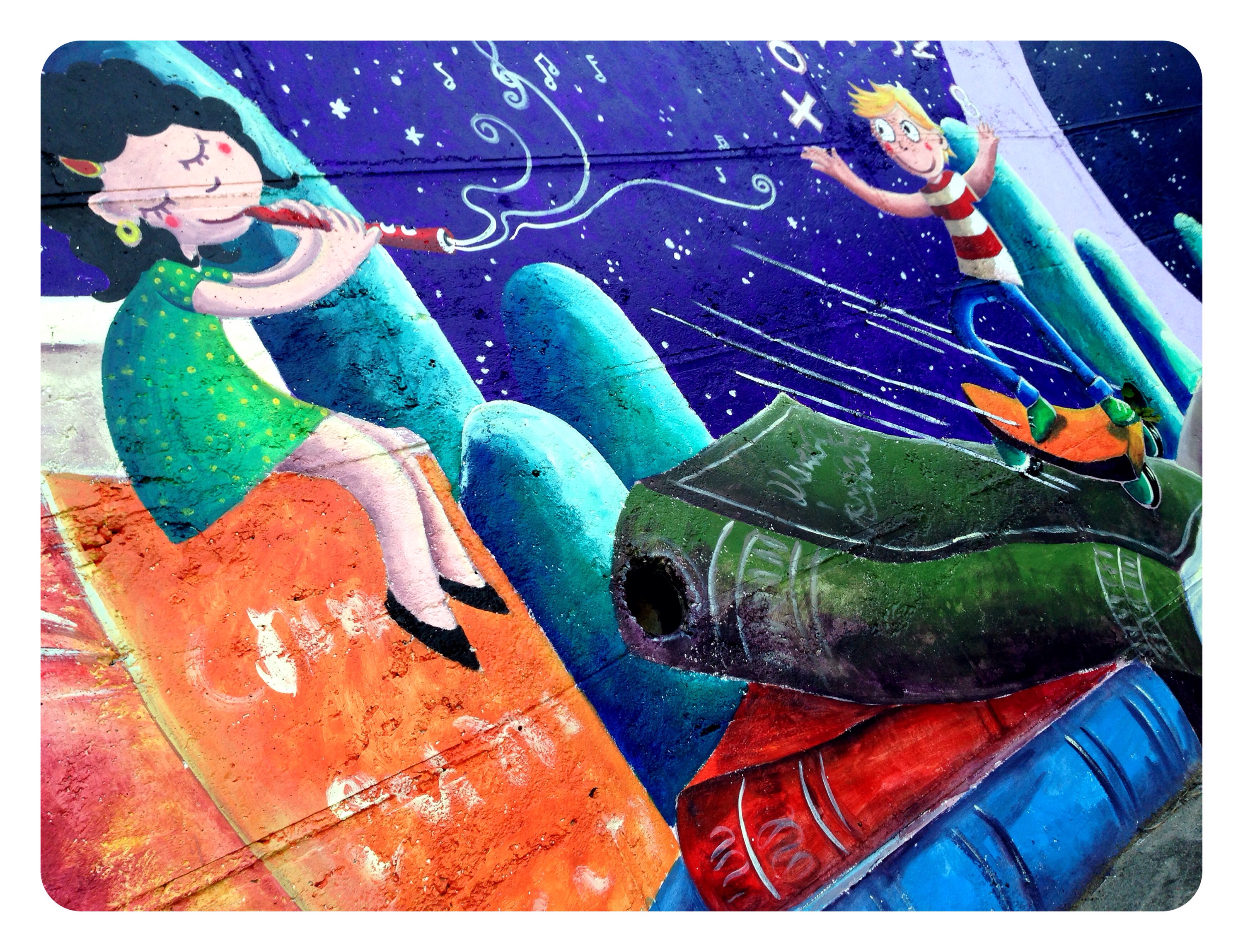 Cuando me propusieron ilustrar esta gran pared…quise darle un aire diferente a anteriores trabajos míos, ilustraciones algo más grandes y mayor contraste, ilustraciones más «limpias» menos cargadas…el COLOR tenía que jugar un papel vital.