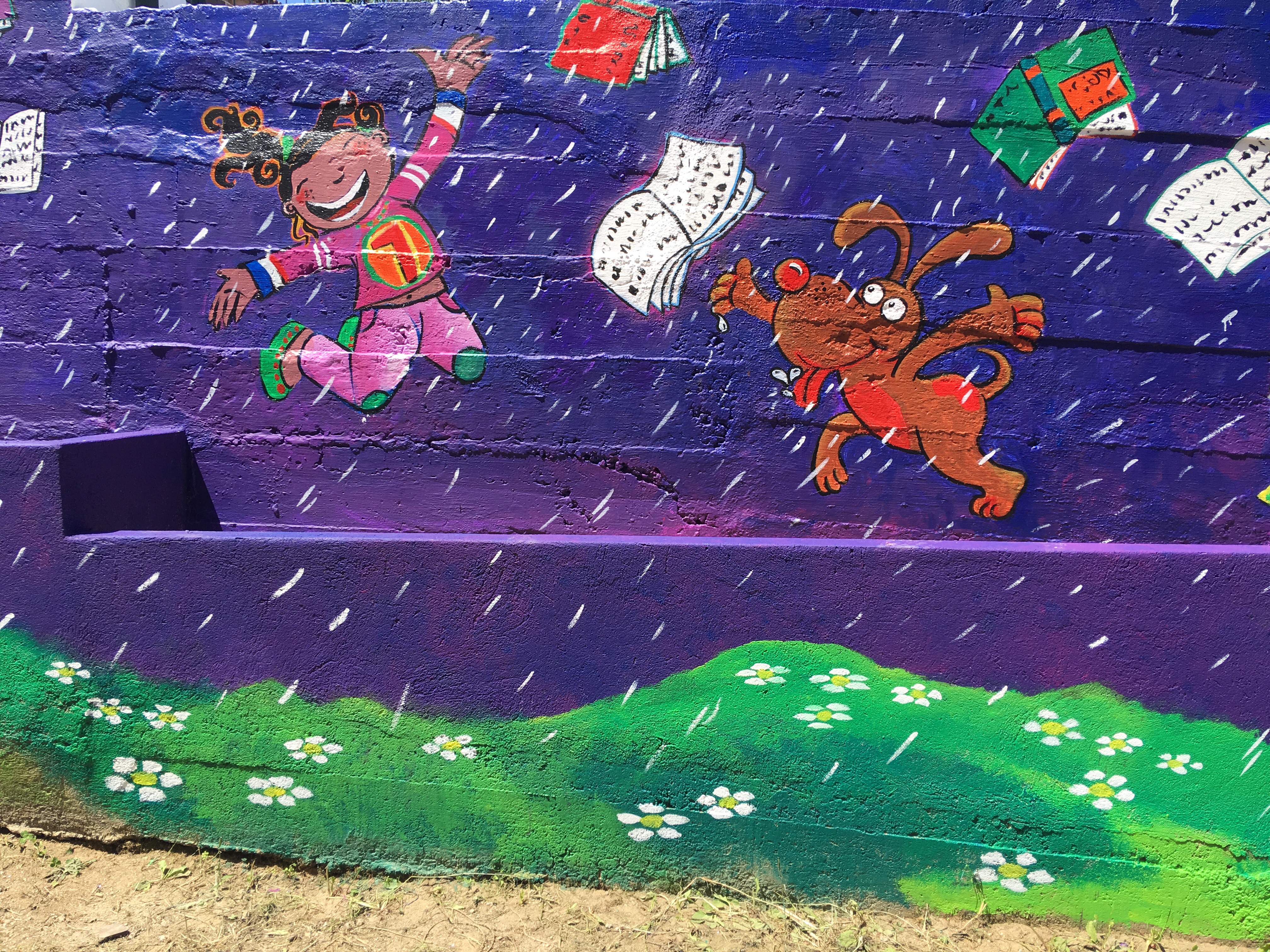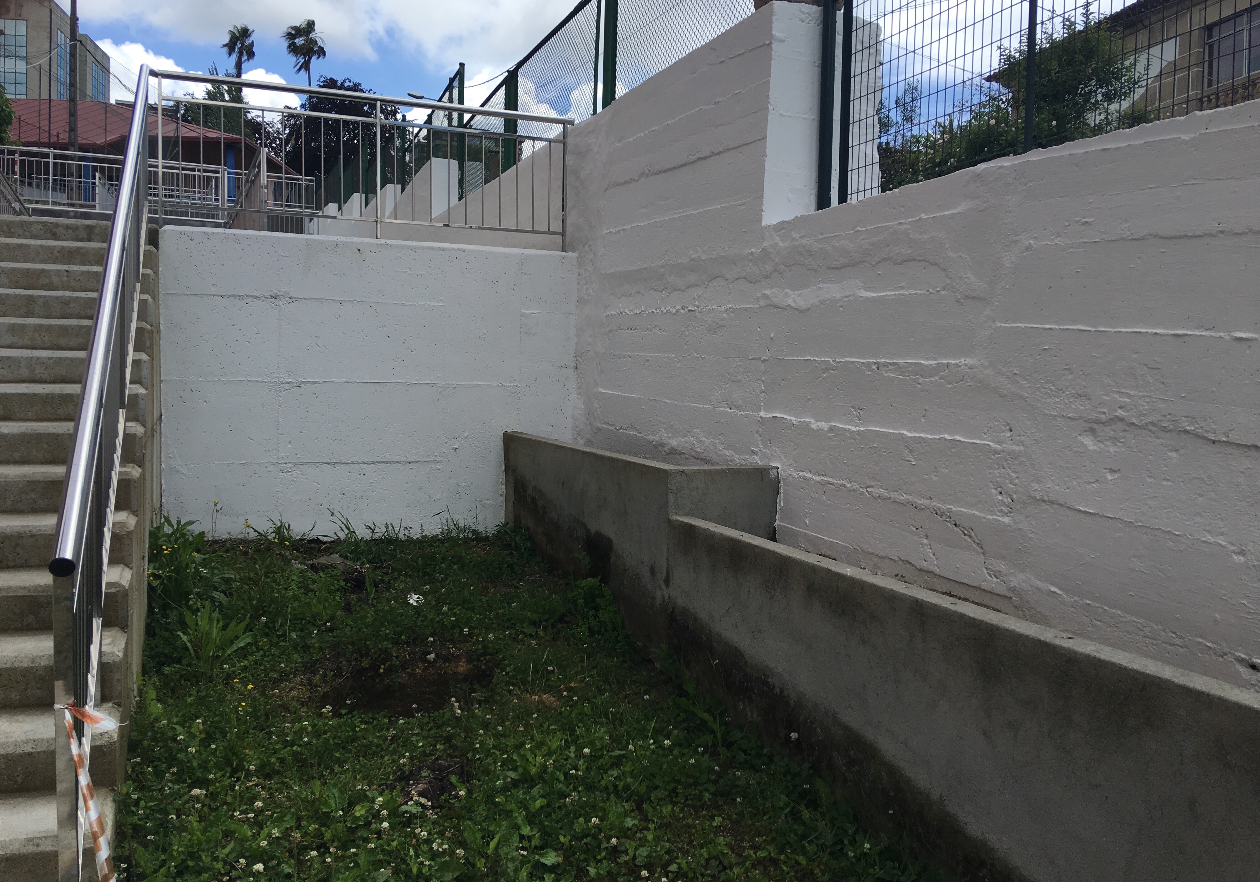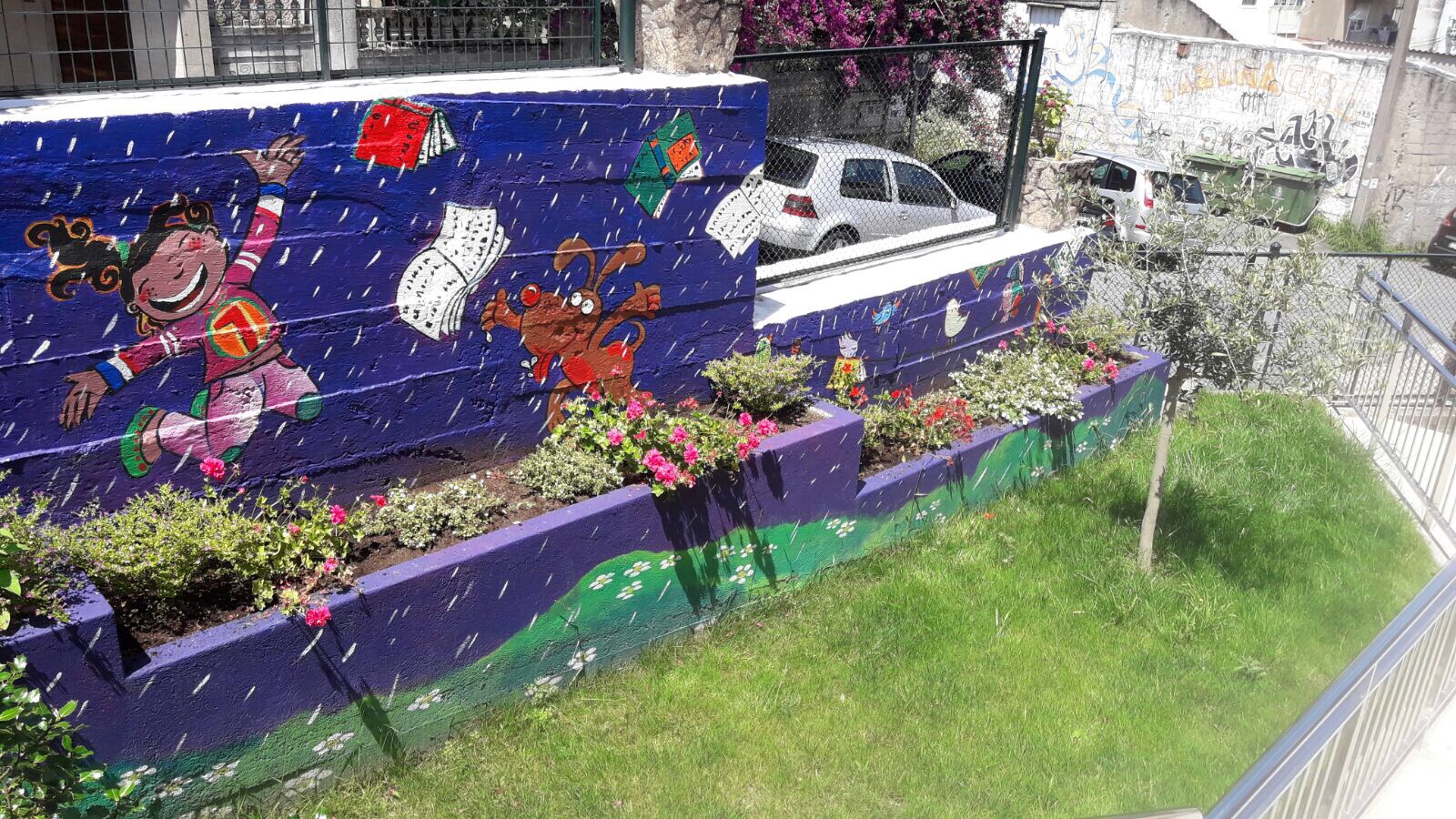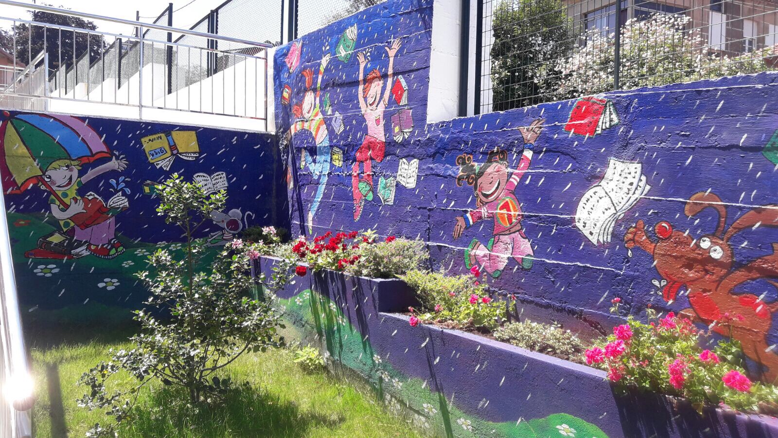…imagen de Mural un año después…con las jardineras en flor y el jardín terminado: