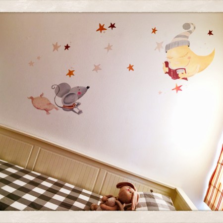 Mural dormitorio bebé: La Luna cuentacuentos lee a un atento ratoncillo antes de dormir.