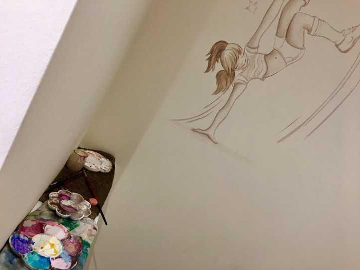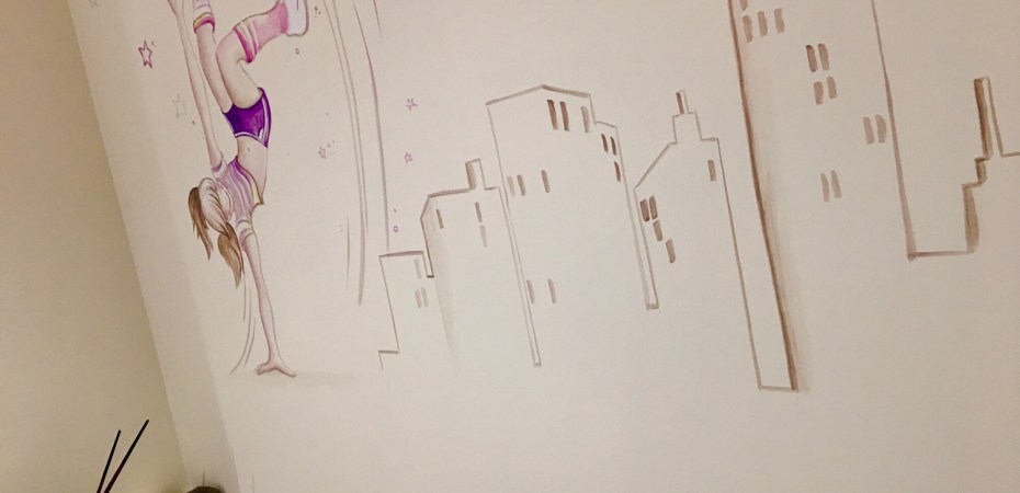 En la Ciudad de Ourense duerme otra nueva ilustraciòn sobre la pared del dormitorio de una niña deportista, a la que le encanta la danza urbana, el funky, hip hop…y le gusta dormir entre Estrellas…